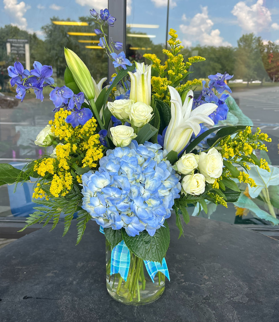 We add more focal flowers to the arrangement as you go up in size, for example Roses, Lilies, Hydrangeas, etc. This generally increases the  overall size because we are increasing the number of stems in the arrangement.