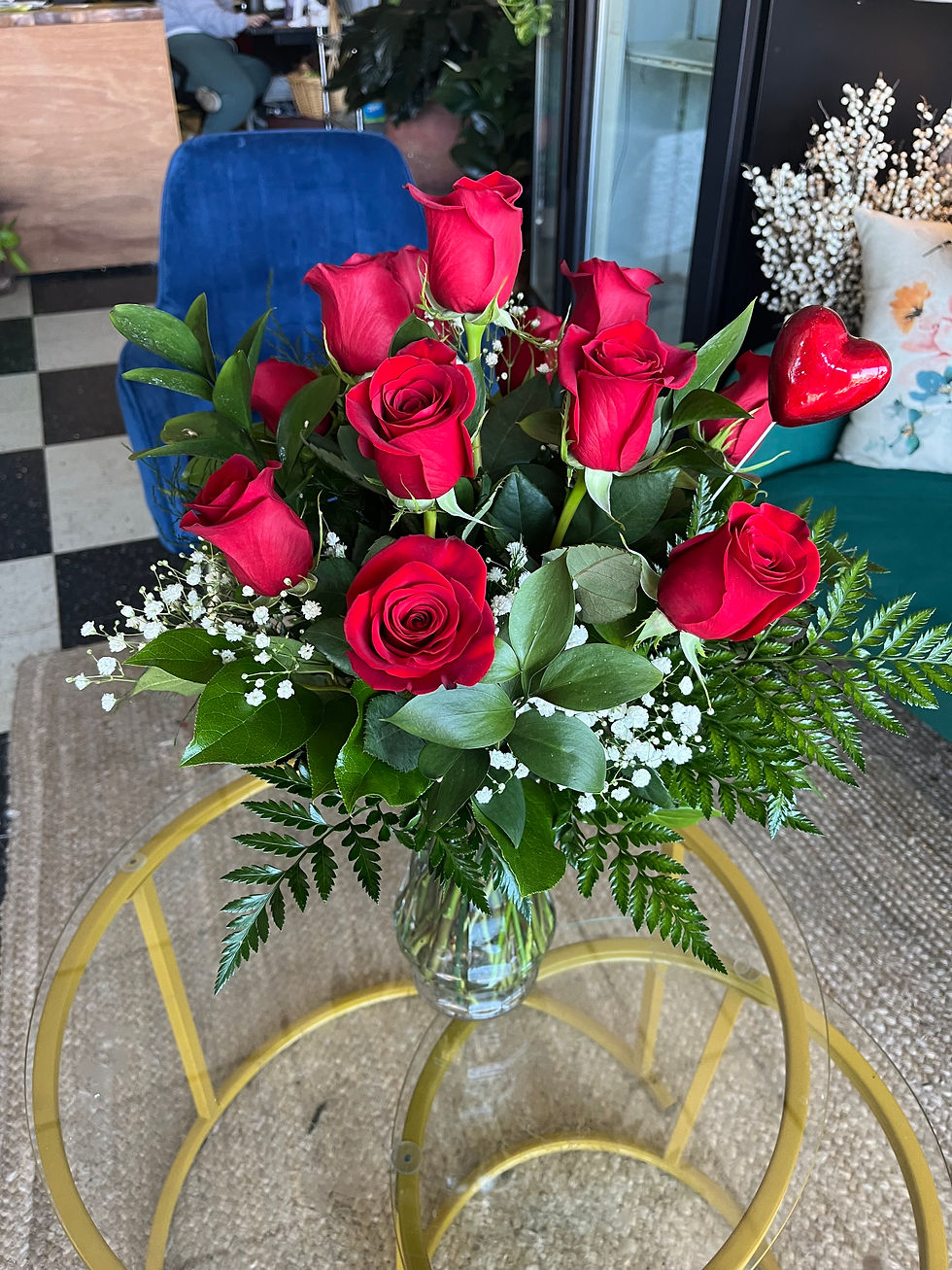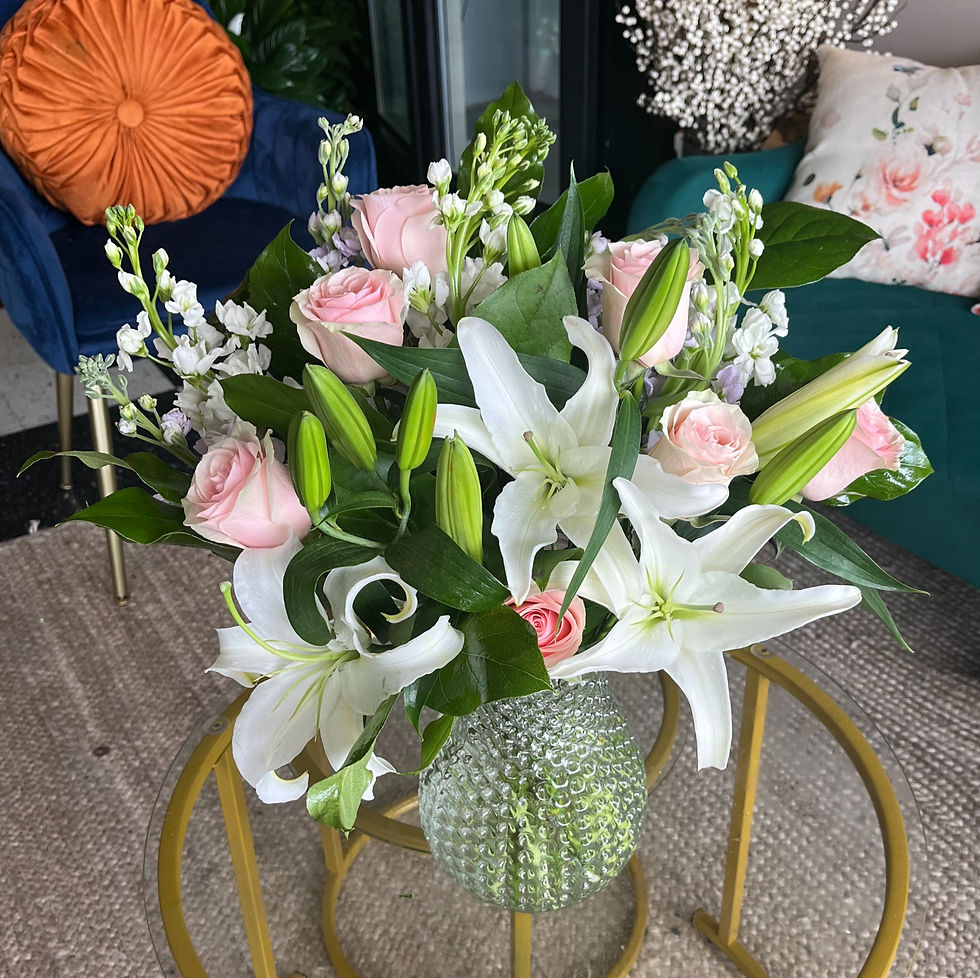 We add more focal flowers to the arrangement as you go up in size, for example Roses, Lilies, Hydrangeas, etc. This generally increases the overall size because we are increasing the number of stems in the arrangement.